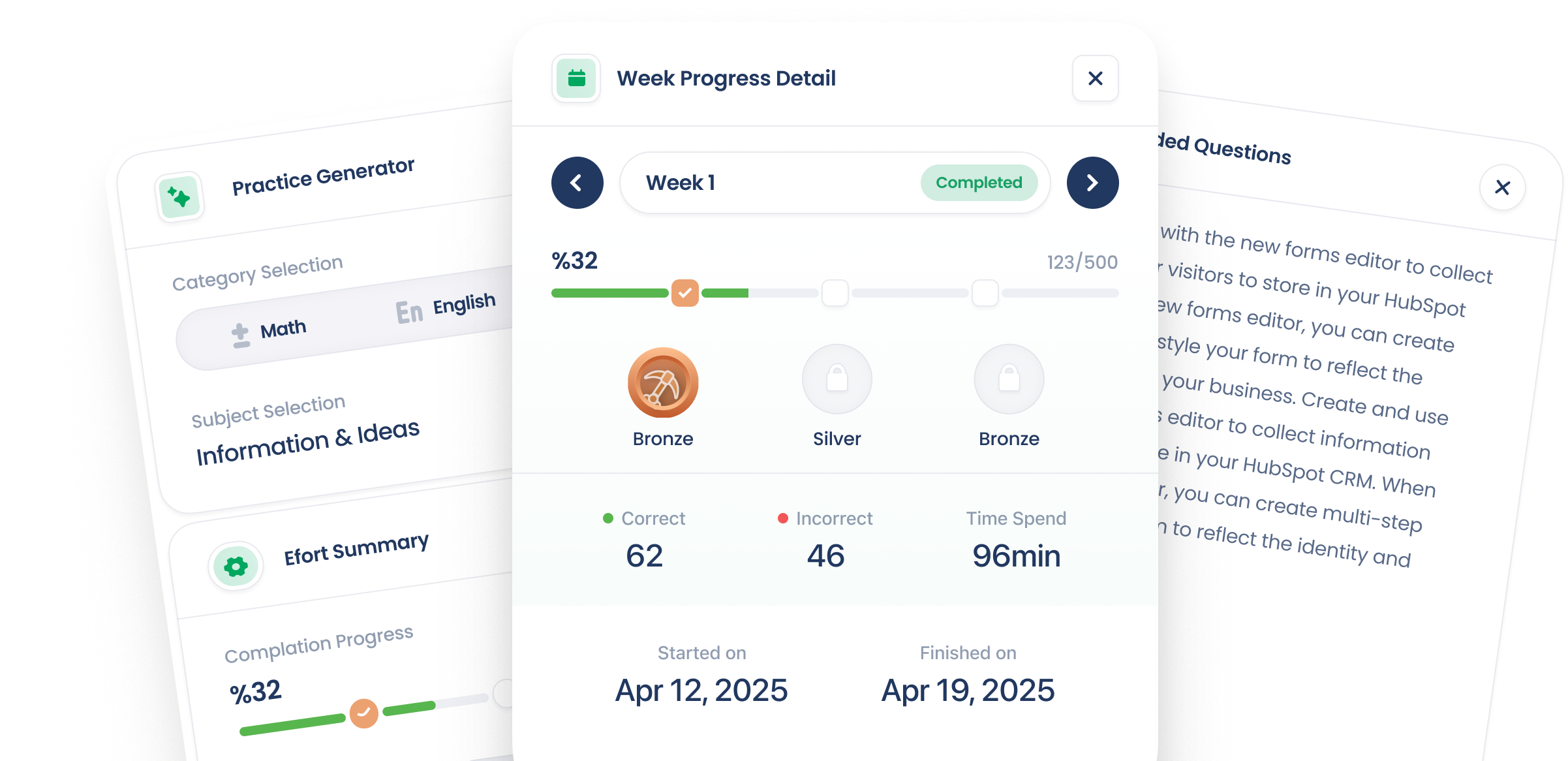Every session is guided by real-time diagnostics and adaptive difficulty. You stay in the flow, strengthen weak spots, and retain knowledge longer. On test day, nothing feels unfamiliar. The result is less grind, more gain, and measurable confidence.